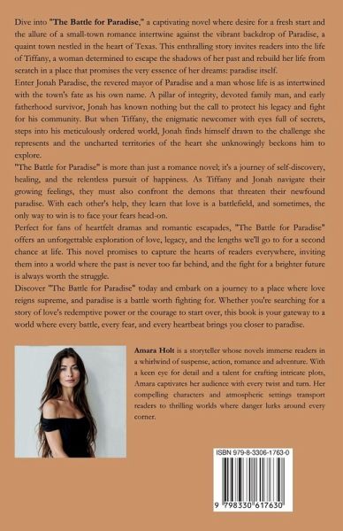 Dive into "The Battle for Paradise," a captivating novel where desire for a fresh start and the allure of a small-town romance intertwine against the vibrant backdrop of Paradise, a quaint town nestled in the heart of Texas. This enthralling story invites readers into the life of Tiffany, a woman determined to escape the shadows of her past and rebuild her life from scratch in a place that promises the very essence of her dreams: paradise itself. Enter Jonah Paradise, the revered mayor of Paradise and a man whose life is as intertwined with the town's fate as his own name. A pillar of integrity, devoted family man, and early fatherhood survivor, Jonah has known nothing but the call to protect his legacy and fight for his community. But when Tiffany, the enigmatic newcomer with eyes full of secrets, steps into his meticulously ordered world, Jonah finds himself drawn to the challenge she represents and the uncharted territories of the heart she unknowingly beckons him to explore. "The Battle for Paradise" is more than just a romance novel; it's a journey of self-discovery, healing, and the relentless pursuit of happiness. As Tiffany and Jonah navigate their growing feelings, they must also confront the demons that threaten their newfound paradise. With each other's help, they learn that love is a battlefield, and sometimes, the only way to win is to face your fears head-on. Perfect for fans of heartfelt dramas and romantic escapades, "The Battle for Paradise" offers an unforgettable exploration of love, legacy, and the lengths we'll go to for a second chance at life. This novel promises to capture the hearts of readers everywhere, inviting them into a world where the past is never too far behind, and the fight for a brighter future is always worth the struggle. Discover "The Battle for Paradise" today and embark on a journey to a place where love reigns supreme, and paradise is a battle worth fighting for. Whether you're searching for a story of love's redemptive power or the courage to start over, this book is your gateway to a world where every battle, every fear, and every heartbeat brings you closer to paradise.