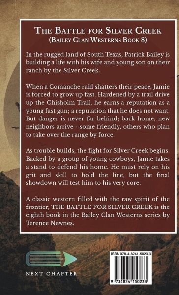 In the rugged land of South Texas, Patrick Bailey is building a life with his wife and young son on their ranch by the Silver Creek. When a Comanche raid shatters their peace, Jamie is forced to grow up fast. Hardened by a trail drive up the Chisholm Trail, he earns a reputation as a young fast gun; a reputation that he does not want. But danger is never far behind; back home, new neighbors arrive - some friendly, others who plan to take over the range by force. As trouble builds, the fight for Silver Creek begins. Backed by a group of young cowboys, Jamie takes a stand to defend his home. He must rely on his grit and skill to hold the line, but the final showdown will test him to his very core. A classic western filled with the raw spirit of the frontier, THE BATTLE FOR SILVER CREEK is the eighth book in the Bailey Clan Westerns series by Terence Newnes.