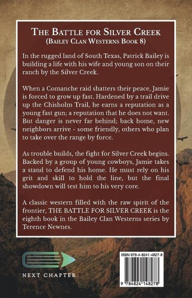 In the rugged land of South Texas, Patrick Bailey is building a life with his wife and young son on their ranch by the Silver Creek. When a Comanche raid shatters their peace, Jamie is forced to grow up fast. Hardened by a trail drive up the Chisholm Trail, he earns a reputation as a young fast gun; a reputation that he does not want. But danger is never far behind; back home, new neighbors arrive - some friendly, others who plan to take over the range by force. As trouble builds, the fight for Silver Creek begins. Backed by a group of young cowboys, Jamie takes a stand to defend his home. He must rely on his grit and skill to hold the line, but the final showdown will test him to his very core. A classic western filled with the raw spirit of the frontier, THE BATTLE FOR SILVER CREEK is the eighth book in the Bailey Clan Westerns series by Terence Newnes.