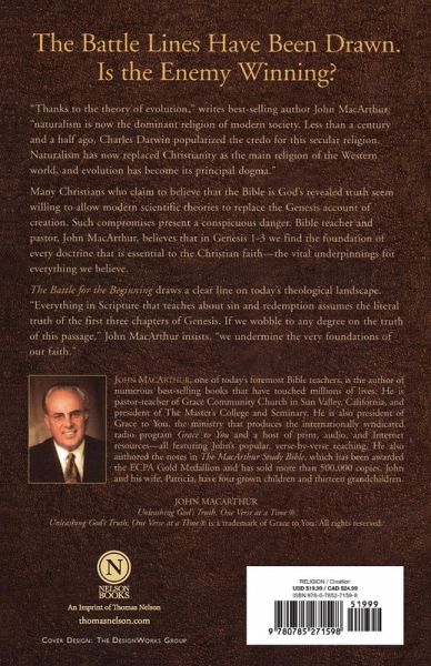 The battle lines have been drawn. Is the enemy winning? "Thanks to the theory of evolution," writes best-selling author John MacArthur, "naturalism is now the dominant religion of modern society. Less than a century and a half ago, Charles Darwin popularized the credo for this secular religion. Naturalism has now replaced Christianity as the main religion of the Western world, and evolution has become its principal dogma." Many Christians who claim to believe that the Bible is God's revealed truth seem willing to allow modern scientific theories to replace the Genesis account of creation. Such compromises present a conspicuous danger. Bible teacher and pastor, John MacArthur, believes that in Genesis 1-3 we find the foundation of every doctrine that is essential to the Christian faith?the vital underpinnings for everything we believe. The Battle for the Beginning draws a clear line on today's theological landscape. "Everything in Scripture that teaches about sin and redemption assumes the literal truth of the first three chapters of Genesis. If we wobble to any degree on the truth of this passage," John MacArthur insists, "we undermind the very foundations of our faith."