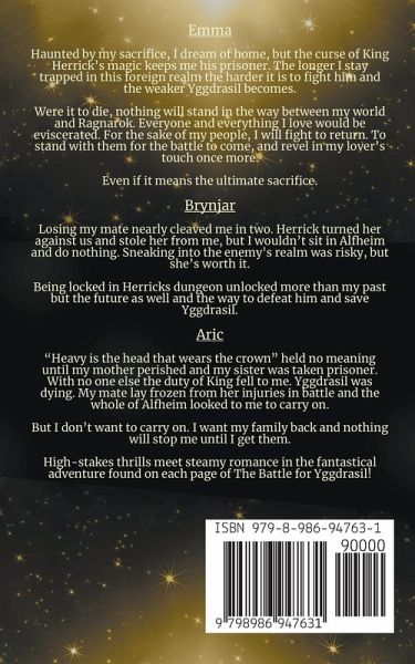 Emma ¿ Haunted by my sacrifice, I dream of home, but the curse of King Herrick's magic keeps me his prisoner. The longer I stay trapped in this foreign realm, the harder it is to fight him, and the weaker Yggdrasil becomes. ¿ Were it to die, nothing will stand in the way between my world and Ragnarok. Everyone and everything I love would be eviscerated. For the sake of my people, I will fight to return. To stand with them for the battle to come, and revel in my lover's touch once more. Even if it means the ultimate sacrifice. ¿ Brynjar Losing my mate nearly cleaved me in two. Herrick turned her against us and stole her from me, but I wouldn't sit in Alfheim and do nothing. Sneaking into the enemy's realm was risky, but she's worth it. Being locked in Herrick's dungeon unlocked more than my past but the future as well, and the way to defeat him and save Yggdrasil. Aric Heavy is the head that wears the crown held no meaning until my mother perished and my sister was taken prisoner. With no one else, the duty of king fell to me. Yggdrasil was dying. My mate lay frozen from her injuries in battle, and the whole of Alfheim looked at me to carry on. But I don't want to carry on. I want my family back and nothing will stop me until they are. ¿ High-stakes thrills meet steamy romance in the fantastical adventure found on each page of The Battle for Yggdrasil!