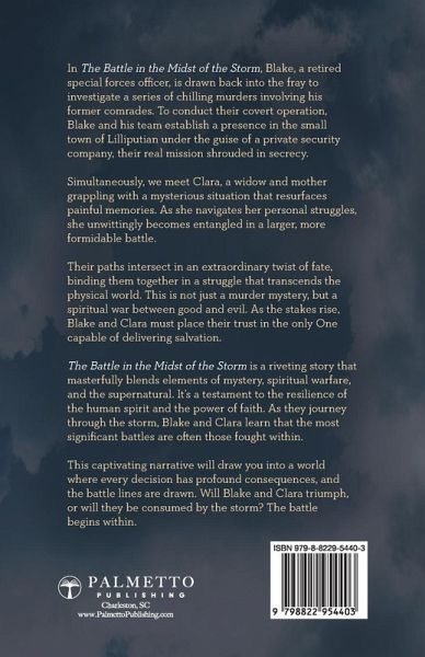 Retired Special Forces Officer Unravels Murder Mystery, Joins Widow in Spiritual Warfare: A Tale of Faith, Courage, and Supernatural Struggles. In The Battle in the Midst of the Storm, we meet Blake, a seasoned veteran of special operations, drawn out of the tranquility of retirement to confront a chilling series of murders. His targets? Former members of his own elite cadre. Blake and his team infiltrate the quaint town of Lilliputian, posing as a private security firm, their true mission hidden beneath this clever ruse. Their objective is clear - to unmask the faceless assassin lurking in the shadows. Parallel to Blake's mission, we encounter Clara, a brave widow and mother of two, ensnared in a mystery that stirs up echoes of her painful past. As she grapples with her own demons, she stumbles upon a battle far greater than she could have ever imagined. Their worlds collide in an unexpected twist of fate, intertwining their destinies in a fight that transcends the physical realm. This is no ordinary murder mystery. It's a spiritual war, a struggle between light and darkness, good and evil. As the tension escalates, Blake and Clara must rely on more than their own strength. Their survival, and the fate of those they hold dear, hinges on their faith in the only One who can truly save them. The Battle in the Midst of the Storm is a gripping tale that seamlessly weaves together elements of mystery, spiritual warfare, and the supernatural. It's a journey of faith and courage, a testament to the power of belief and the unyielding human spirit. As Blake and Clara navigate through the storm, they discover that the greatest battles are often fought within. Prepare to be captivated by this thrilling narrative, where every page turn plunges you deeper into a world where the stakes are high, and the battle is real. Will Blake and Clara emerge victorious, or will they succumb to the storm? The battle begins within.