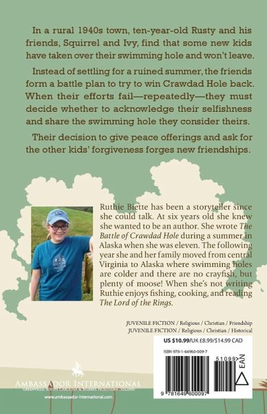 "Ruthie's characters, scenes, and dialogue fall off her pen with a seemingly effortless grace." Dandelion Press In a rural 1940s town, ten-year-old Rusty and his friends, Squirrel and Ivy, find that some new kids have taken over their swimming hole and won't leave. Instead of settling for a ruined summer, the friends form a battle plan to try to win Crawdad Hole back. When their efforts fail-repeatedly-they must decide whether to acknowledge their selfishness and share the swimming hole they consider theirs. Their decision to give peace offerings and ask for the other kids' forgiveness forges new friendships.