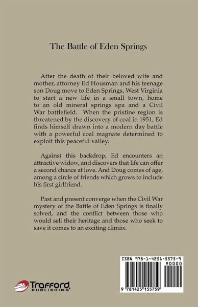 After the death of their beloved wife and mother, attorney Ed Housman and his teenage son Doug move to Eden Springs, West Virginia to start a new life in a small town, home to an old mineral springs spa and a Civil War battlefield. When the pristine region is threatened by the discovery of coal in 1951, Ed finds himself drawn into a modern day battle with a powerful coal magnate determined to exploit this peaceful valley. Against this backdrop, Ed encounters an attractive widow, and discovers that life can offer a second chance at love. And Doug comes of age, among a circle of friends which grows to include his first girlfriend. Past and present converge when the Civil War mystery of the Battle of Eden Springs is finally solved, and the conflict between those who would sell their heritage and those who seek to save it comes to an exciting climax.
