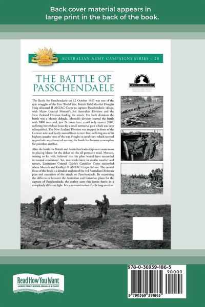 The Battle for Passchendaele on 12 October 1917 was one of the epic struggles of the First World War. British Field Marshal Douglas Haig allocated II ANZAC Corps to capture Passchendaele village, with Major General Monash's 3rd Australian Division and the New Zealand Division leading the attack. For both divisions the battle was a bloody debacle. Monash's division started the battle with 5800 men and, just 24 hours later, could only muster 2600, suffering horrendous losses for a small territorial gain which was later relinquished. The New Zealand Division was trapped in front of the German wire and barely moved from its start line, suffering one of its highest casualty rates of the war. Fought in conditions which seemed to preclude any chance of success, the battle has become a metaphor for pointless sacrifice. After the battle the British and Australian leadership were unanimous in placing blame for the defeat on the all-pervasive mud. Monash, writing to his wife, believed that his plan 'would have succeeded in normal conditions'. Yet, two weeks later, in similar weather and terrain, Lieutenant General Currie's Canadian Corps succeeded where Monash and Godley's II ANZAC Corps did not. The central focus of this book is a detailed analysis of the 3rd Australian Division's plan and execution of the attack on Passchendaele. By examining the differences between the Australian and Canadian plans for the capture of Passchendaele, the author casts this iconic battle in a completely different light. It is a re-examination that is long overdue.