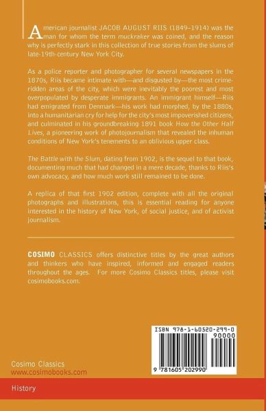American journalist JACOB AUGUST RIIS (1849-1914) was the man for whom the term muckraker was coined, and the reason why is perfectly stark in this collection of true stories from the slums of late-19th-century New York City. As a police reporter and photographer for several newspapers in the 1870s, Riis became intimate with-and disgusted by-the most crime-ridden areas of the city, which were inevitably the poorest and most overpopulated by desperate immigrants. An immigrant himself-Riis had emigrated from Denmark-his work had morphed, by the 1880s, into a humanitarian cry for help for the city's most impoverished citizens, and culminated in his groundbreaking 1891 book How the Other Half Lives, a pioneering work of photojournalism that revealed the inhuman conditions of New York's tenements to an oblivious upper class. The Battle with the Slum, dating from 1902, is the sequel to that book, documenting much that had changed in a mere decade, thanks to Riis's own advocacy, and how much work still remained to be done. A replica of that first 1902 edition, complete with all the original photographs and illustrations, this is essential reading for anyone interested in the history of New York, of social justice, and of activist journalism.