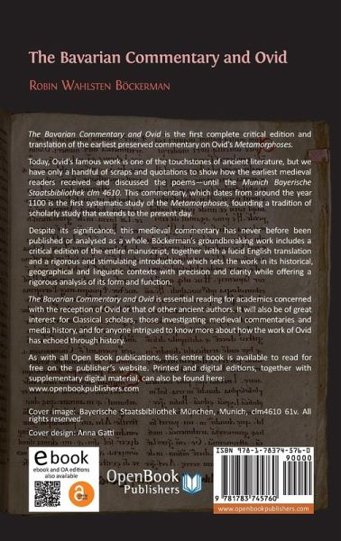 The Bavarian Commentary and Ovid is the first complete critical edition and translation of the earliest preserved commentary on Ovid's Metamorphoses. Today, Ovid's famous work is one of the touchstones of ancient literature, but we have only a handful of scraps and quotations to show how the earliest medieval readers received and discussed the poems-until the Munich Bayerische Staatsbibliothek clm 4610. This commentary, which dates from around the year 1100 is the first systematic study of the Metamorphoses, founding a tradition of scholarly study that extends to the present day. Despite its significance, this medieval commentary has never before been published or analysed as a whole. Böckerman's groundbreaking work includes a critical edition of the entire manuscript, together with a lucid English translation and a rigorous and stimulating introduction, which sets the work in its historical, geographical and linguistic contexts with precision and clarity while offering a rigorous analysis of its form and function. The Bavarian Commentary and Ovid is essential reading for academics concerned with the reception of Ovid or that of other ancient authors. It will also be of great interest for Classical scholars, those investigating medieval commentaries and media history, and for anyone intrigued to know more about how the work of Ovid has echoed through history.