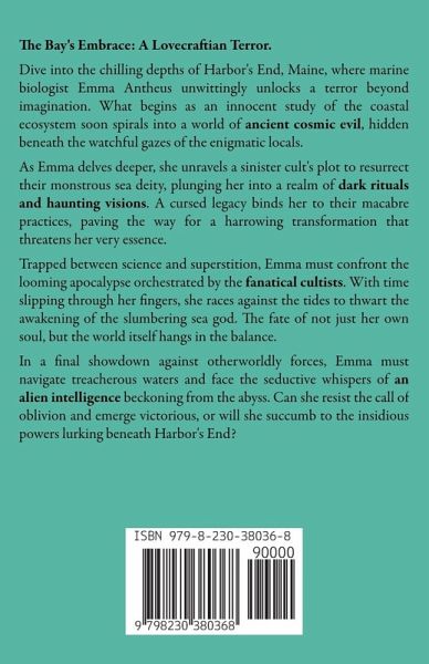 The Bay's Embrace: A Lovecraftian Terror. Dive into the chilling depths of Harbor's End, Maine, where marine biologist Emma Antheus unwittingly unlocks a terror beyond imagination. What begins as an innocent study of the coastal ecosystem soon spirals into a world of ancient cosmic evil, hidden beneath the watchful gazes of the enigmatic locals. As Emma delves deeper, she unravels a sinister cult's plot to resurrect their monstrous sea deity, plunging her into a realm of dark rituals and haunting visions. A cursed legacy binds her to their macabre practices, paving the way for a harrowing transformation that threatens her very essence. Trapped between science and superstition, Emma must confront the looming apocalypse orchestrated by the fanatical cultists. With time slipping through her fingers, she races against the tides to thwart the awakening of the slumbering sea god. The fate of not just her own soul, but the world itself hangs in the balance. In a final showdown against otherworldly forces, Emma must navigate treacherous waters and face the seductive whispers of an alien intelligence beckoning from the abyss. Can she resist the call of oblivion and emerge victorious, or will she succumb to the insidious powers lurking beneath Harbor's End?