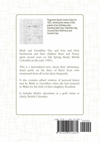 Mark and Gwenllian Day went from England to British Colombia with the hope of having some success in gold mining. They joined Mark's sister, Una Richmond and her husband Dick, who had gone out a few months earlier, and had got involved in market gardening. Also in on the adventure were Mrs. Caroline Day, Mark and Una's recently widowed mother, and Una and Dick's son, Peter.
