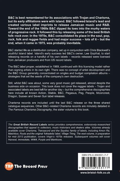 B&C started life as a distribution company, which was set up as a sister company to Island. Island's early success led B&C's owner, Lee Gopthal, to start releasing records in his own right. However, B&C's main strategy was based on licensing records rather than signing artists in its own right and many of B&C's labels concentrated on singles and budget compilation albums - strategies that set the seeds of the company's own destruction. The end, when it came in 1975 was probably inevitable. Still, whilst B&C was about, some very good music got released, almost despite itself on occasion. This book includes comprehensive discographies covering the Action, Stable, B&C, Charisma, Pegasus, Peg, People, Mooncrest, Dragon, Sussex and Seven Sun labels.