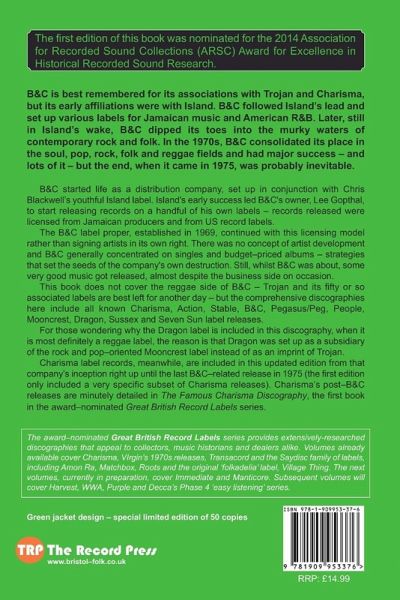 Updated and expanded second edition of this Award Nominated book (nominated for the 2014 ARSC Award for Excellence in Historical Recorded Sound Research). Strictly limited edition of 50 copies in green jacket design. B&C started life as a distribution company, which was set up as a sister company to Island. Island's early success led B&C's owner, Lee Gopthal, to start releasing records in his own right. However, B&C's main strategy was based on licensing records rather than signing artists in its own right and many of B&C's labels concentrated on singles and budget compilation albums - strategies that set the seeds of the company's own destruction. The end, when it came in 1975 was probably inevitable. Still, whilst B&C was about, some very good music got released, almost despite itself on occasion. This book includes comprehensive discographies covering the Action, Stable, B&C, Charisma, Pegasus, Peg, People, Mooncrest, Dragon, Sussex and Seven Sun labels.