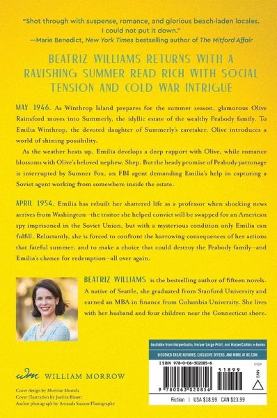 "There are few more skilled practitioners of the craft of summer fiction than Beatriz Williams." — The New York Times Book Review A ravishing summer read from New York Times bestseller Beatriz Williams, sweeping readers back to a mid-century New England rich with secrets and Cold War intrigue. June 1946. As the residents of Winthrop Island prepare for the first summer season after the sacrifice of war, a glamorous new figure moves into the guest cottage at Summerly, the idyllic seaside estate of the wealthy Peabody family. To Emilia Winthrop, daughter of Summerly’s year-round caretaker and a descendant of the island’s settlers, Olive Rainsford opens a window into a world of shining possibility. While Emilia spent the war years caring for her incapacitated mother, Olive traveled the world, married fascinating men, and involved herself in political causes. She’s also the beloved aunt of the two surviving Peabody sons, Amory and Shep, with whom Emilia has a tangled romantic history. As the summer wears on, Emilia develops a deep rapport with Olive, who urges her to leave the island for a life of adventure, while romance blossoms with the sturdy and honorable Shep. But the heady promise of Peabody patronage is blown apart by the arrival of Sumner Fox, an FBI agent who demands Emilia’s help to capture a Soviet agent who’s transmitting vital intelligence on the West’s atomic weapon program from somewhere inside the Summerly estate. April 1954. Eight years later, Summerly is boarded up and Emilia has rebuilt her shattered life as a professor at Wellesley College, when shocking news arrives from Washington—the traitor she helped convict is about to be swapped for an American spy imprisoned in the Soviet Union, but with a mysterious condition only Emilia can fulfill. A reluctant Emilia is summoned to CIA headquarters, where she’s forced to confront the harrowing consequences of her actions that fateful summer, and a choice that could destroy the Peabody family—and Emilia’s chance for redemption—all over again. "Grand and gripping...shot through with suspense, romance, and glorious, beach-laden locales. I could not put it down."--Marie Benedict, New York Times bestselling author of The Mitford Affair