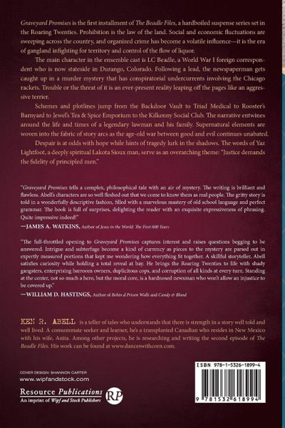 Graveyard Promises is the first installment of The Beadle Files, a hardboiled suspense series set in the Roaring Twenties. Prohibition is the law of the land. Social and economic fluctuations are sweeping across the country, and organized crime has become a volatile influence--it is the era of gangland infighting for territory and control of the flow of liquor. The main character in the ensemble cast is LC Beadle, a World War I foreign correspondent who is now stateside in Durango, Colorado. Following a lead, the newspaperman gets caught up in a murder mystery that has conspiratorial undercurrents involving the Chicago rackets. Trouble or the threat of it is an ever-present reality leaping off the pages like an aggressive terrier. Schemes and plotlines jump from the Backdoor Vault to Triad Medical to Rooster's Barnyard to Jewel's Tea & Spice Emporium to the Kilkenny Social Club. The narrative entwines around the life and times of a legendary lawman and his family. Supernatural elements are woven into the fabric of story arcs as the age-old war between good and evil continues unabated. Despair is at odds with hope while hints of tragedy lurk in the shadows. The words of Yaz Lightfoot, a deeply spiritual Lakota Sioux man, serve as an overarching theme: ""Justice demands the fidelity of principled men.""