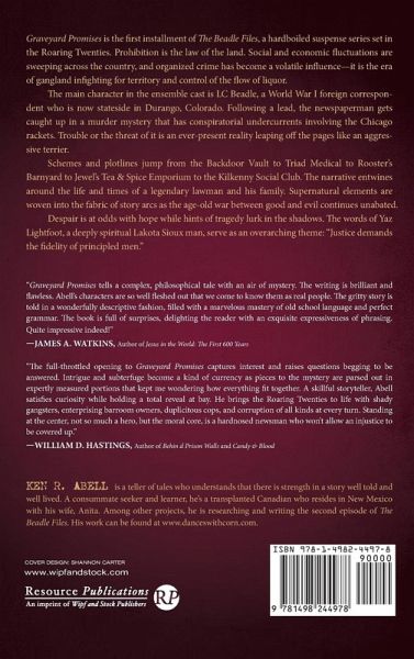Graveyard Promises is the first installment of The Beadle Files, a hardboiled suspense series set in the Roaring Twenties. Prohibition is the law of the land. Social and economic fluctuations are sweeping across the country, and organized crime has become a volatile influence--it is the era of gangland infighting for territory and control of the flow of liquor. The main character in the ensemble cast is LC Beadle, a World War I foreign correspondent who is now stateside in Durango, Colorado. Following a lead, the newspaperman gets caught up in a murder mystery that has conspiratorial undercurrents involving the Chicago rackets. Trouble or the threat of it is an ever-present reality leaping off the pages like an aggressive terrier. Schemes and plotlines jump from the Backdoor Vault to Triad Medical to Rooster's Barnyard to Jewel's Tea & Spice Emporium to the Kilkenny Social Club. The narrative entwines around the life and times of a legendary lawman and his family. Supernatural elements are woven into the fabric of story arcs as the age-old war between good and evil continues unabated. Despair is at odds with hope while hints of tragedy lurk in the shadows. The words of Yaz Lightfoot, a deeply spiritual Lakota Sioux man, serve as an overarching theme: ""Justice demands the fidelity of principled men.""