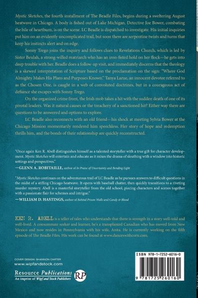 Mystic Sketches, the fourth installment of The Beadle Files, begins during a sweltering August heatwave in Chicago. A body is fished out of Lake Michigan. Detective Joe Bower, combating the bile of heartburn, is on the scene. LC Beadle is dispatched to investigate. His initial inquiries put him on an evidently uncomplicated trail, but soon there are serpentine twists and turns that keep his instincts alert and on edge. Sonny Trego joins the inquiry and follows clues to Revelations Church, which is led by Sister Beulah, a strong-willed matriarch who has an iron-fisted hold on her flock--he gets into deep trouble with her. Beadle does a follow-up visit, and immediately discerns that the theology is a skewed interpretation of Scripture based on the proclamation on the sign: ""Where God Almighty Makes His Plans and Purposes Known."" Tanya Larue, an innocent devotee referred to as the Chosen One, is caught in a web of convoluted doctrines, but in a courageous act of defiance she escapes with Sonny Trego. On the organized crime front, the Irish mob takes a hit with the sudden death of one of its pivotal leaders. Was it natural causes or the treachery of a sanctioned hit? Either way there are questions to be answered and options to explore. LC Beadle also reconnects with an old friend--his shock at meeting Sylvia Bower at the Chicago Mission momentarily rendered him speechless. Her story of hope and redemption thrills him, and the bonds of their relationship are quickly reconstructed.