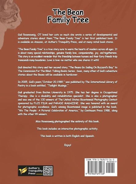 Gail Rosensweig, OT loved her cats so much she wrote a series of developmental and adventure stories about them. "The Bean Family Tree" is her first published book. It is available on Amazon, at Author¿s Tranquility Press, and at many retail bookstores. "The Bean Family Tree" is a true story sure to warm the hearts of readers across all ages. It is about many special relationships, genuine family love, companionship, joy, and togetherness. This story is an excellent reminder that the friendship between humans and their furry friends truly transcends many boundaries. Love is love-no matter who one shares it with! Gail donated this story and her second story, "The Beans Go Sailing On Buzzard¿s Bay " to The Commission For The Blind-Talking Books Series. Soon, many other of Gail¿s adventure stories about the Beans will be available in hardcover. Presently a screenplay for this story is being considered for submission to Netflix for an animated children¿s film. Keep your fingers crossed, or perhaps look elsewhere. In 2005, Gail¿s poem, "October 20, 1989," was published by The International Library of Poetry in a book entitled, "Twilight Musings." Gail graduated from Boston University in 1975. She has her degree in Occupational Therapy. She is a disability and rehabilitation specialist. She is also a photographer and was one of the 100 winners of The United States Bicentennial Photography Contest sponsored by FUJI FILM and PARADE MAGAZINE. She was honored with an award for photographic excellence. Gail¿s winning Bicentennial image is published in the book, "We The People: A Pictorial Celebration of America," by Continuum Press 1988, along with the other 99 winners. Miss Rosensweig photographed the entirety of this book. This book includes an interactive photographic activity. This book is written in both English and Spanish. Enjoy!