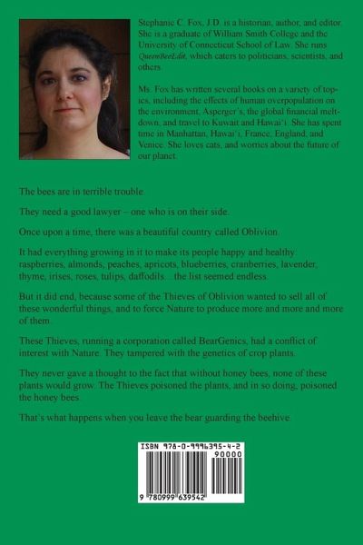 This is an allegorical tale of honeybee colony collapse, and the threat that poses to the Earth's ecosystem. The bees are in terrible trouble. They need a good lawyer - one who is on their side. Once upon a time, there was a beautiful country called Oblivion. It had everything growing in it to make its people happy and healthy: raspberries, almonds, peaches, apricots, blueberries, cranberries, lavender, thyme, irises, roses, tulips, daffodils...the list seemed endless. But it did end, because some of the Thieves of Oblivion wanted to sell all of these wonderful things, and to force Nature to produce more and more and more of them. These Thieves, running a corporation called BearGenics, had a conflict of interest with Nature. They tampered with the genetics of crop plants. They never gave a thought to the fact that without honey bees, none of these plants would grow. The Thieves poisoned the plants, and in so doing, poisoned the honey bees. That's what happens when you leave the bear guarding the beehive.