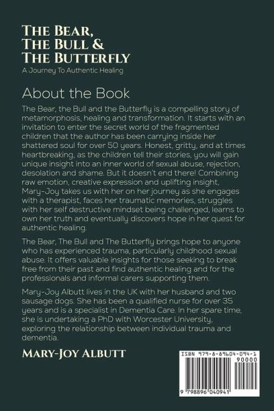 THE BEAR, THE BULL AND THE BUTTERFLY: A Journey To Authentic Healing by Mary-Joy Albutt is a powerful memoir of resilience and healing. Through personal stories, reflections, and poetry, Mary-Joy shares her journey from childhood trauma and dissociation to self-discovery and renewal. Divided into five parts, the book explores survival, transformation, and the hope of reclaiming one's life, offering inspiration and understanding to those facing trauma or supporting others on their healing path.