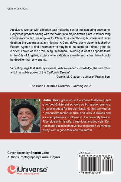 An elusive woman with a hidden past holds the secret that can bring down a hot Hollywood producer along with the owner of a major aircraft plant. A former tong courtesan who fled Los Angeles for China, loses her thriving business and faces death as the Japanese attack Nanjing. A Central Ave. piano player is tasked by Federal Agents to find a woman who may hold the secret to a fifteen year old incident known as the "Point Magu Massacre." Nothing is what it appears to be in the City of Angeles, a place where deals are made and a best friend could be deadlier than any enemy. "A riveting saga that skillfully exposes, with an insider's knowledge, the corruption and irresistible power of the California Dream" - Dennis M. Clausen, author of Prairie Son.