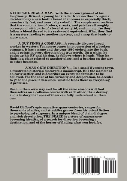 A Couple Grows a Map... With the encouragement of his longtime girlfriend, a young bank teller from northern Virginia decides to try a new look: a beard that comes in especially thick, unnaturally fast, and unusually colorful. The couple soon realizes that the combination of colors, streaks, and patches all roughly correspond with parts of a local street grid, and on impulse they follow a blond thread to its real-world equivalent. What they find is a mystery leading to another mystery, and a map that leads to more maps. David Clifford's epic narrative spans centuries, ranges for thousands of miles, and straddles genres from historical fiction to psychological suspense. In a unique blend of plain dialogue and rich description, THE BEARD is a story of appearance becoming identity, of a search for direction becoming a destination, and of the horror of finding what you look for.