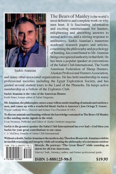 The Bears of Manley, a 448 page, perfect bound book by Alaskan, Sarkis Atamian, is exciting entertainment for hunters. This is not a typical Joe Hunter went afield, stalked his quarry, shot his trophy, hunting book. The Bears of Manley includes stories of an Alaskan trophy hunter and his quest for the ultimate trophy and his hunts which did not go as planned. The book also gives enlightening and absorbing answers to animal activists, and a stirring response to antihunters. Sarkis Atamian's numerous academic research papers and articles, concerning the philosophy and psychology of hunting, has contributed to Mr. Atamian being a recognized authority in the field.