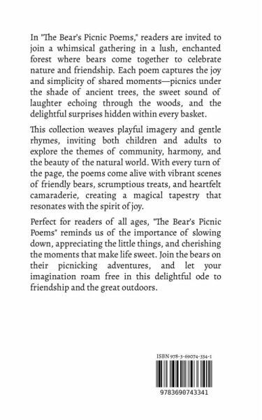 In "The Bear's Picnic Poems," readers are invited to join a whimsical gathering in a lush, enchanted forest where bears come together to celebrate nature and friendship. Each poem captures the joy and simplicity of shared moments-picnics under the shade of ancient trees, the sweet sound of laughter echoing through the woods, and the delightful surprises hidden within every basket. This collection weaves playful imagery and gentle rhymes, inviting both children and adults to explore the themes of community, harmony, and the beauty of the natural world. With every turn of the page, the poems come alive with vibrant scenes of friendly bears, scrumptious treats, and heartfelt camaraderie, creating a magical tapestry that resonates with the spirit of joy. Perfect for readers of all ages, "The Bear's Picnic Poems" reminds us of the importance of slowing down, appreciating the little things, and cherishing the moments that make life sweet. Join the bears on their picnicking adventures, and let your imagination roam free in this delightful ode to friendship and the great outdoors.