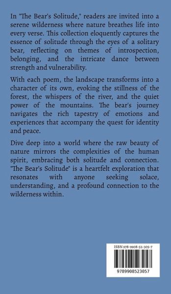 In "The Bear's Solitude," readers are invited into a serene wilderness where nature breathes life into every verse. This collection eloquently captures the essence of solitude through the eyes of a solitary bear, reflecting on themes of introspection, belonging, and the intricate dance between strength and vulnerability. With each poem, the landscape transforms into a character of its own, evoking the stillness of the forest, the whispers of the river, and the quiet power of the mountains. The bear's journey navigates the rich tapestry of emotions and experiences that accompany the quest for identity and peace. Dive deep into a world where the raw beauty of nature mirrors the complexities of the human spirit, embracing both solitude and connection. "The Bear's Solitude" is a heartfelt exploration that resonates with anyone seeking solace, understanding, and a profound connection to the wilderness within.