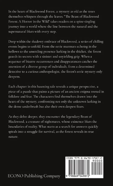 In the heart of Blackwood Forest, a mystery as old as the trees themselves whispers through the leaves. "The Beast of Blackwood Forest: A Horror in the Wild" takes readers on a spine-tingling journey into a world where the line between the natural and the supernatural blurs with every step. Deep within the shadowy embrace of Blackwood, a series of chilling events begins to unfold. From the eerie murmurs echoing in the hollows to the unsettling presence lurking in the thicket, the forest guards its secrets with a sinister and unyielding grip. When a sequence of bizarre occurrences and disappearances catches the attention of a diverse group of individuals, from a determined detective to a curious anthropologist, the forest's eerie mystery only deepens. Each chapter in this haunting tale reveals a unique perspective, a piece of a puzzle that paints a picture of an ancient enigma rooted in folklore and fear. The characters find themselves drawn into the heart of the mystery, confronting not only the unknown lurking in the dense underbrush but also their own deepest fears. As they delve deeper, they encounter the legendary Beast of Blackwood, a creature of nightmares, whose existence blurs the boundaries of reality. What starts as a search for answers quickly spirals into a struggle for survival, as the forest reveals its true nature. "The Beast of Blackwood Forest: A Horror in the Wild" is a gripping tale of suspense, mystery, and horror. It invites readers to lose themselves in a world where ancient trees whisper secrets of the past, and the darkness holds more than just shadows. Hold your breath and step into Blackwood Forest, but be warned: not everyone who wanders the twisted paths emerges to tell their tale.