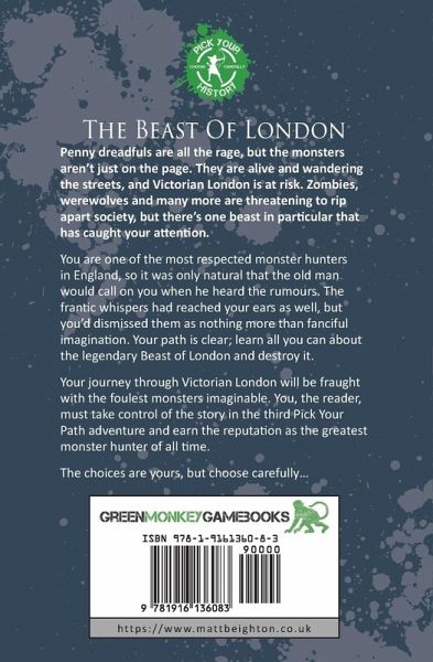 Penny dreadfuls are all the rage, but the monsters aren't just on the page. They are alive and wandering the streets, and Victorian London is at risk. Zombies, werewolves and many more are threatening to rip apart society, but there's one beast in particular that has caught your attention. You are one of the most respected monster hunters in England, so it was only natural that the old man would call on you when he heard the rumours. The frantic whispers had reached your ears as well, but you'd dismissed them as nothing more than fanciful imagination. Your path is clear; learn all you can about the legendary Beast of London and destroy it. Your journey through Victorian London will be fraught with the foulest monsters imaginable. You, the reader, must take control of the story in the third Pick Your Path adventure and earn the reputation as the greatest monster hunter of all time. The choices are yours, but choose carefully... Based on the success of Matt Beighton's dyslexia adapted Monstacademy series, the Pick Your Path Adventure series has been formatted to be accessible to all readers, including those with dyslexia and Irlen syndrome.