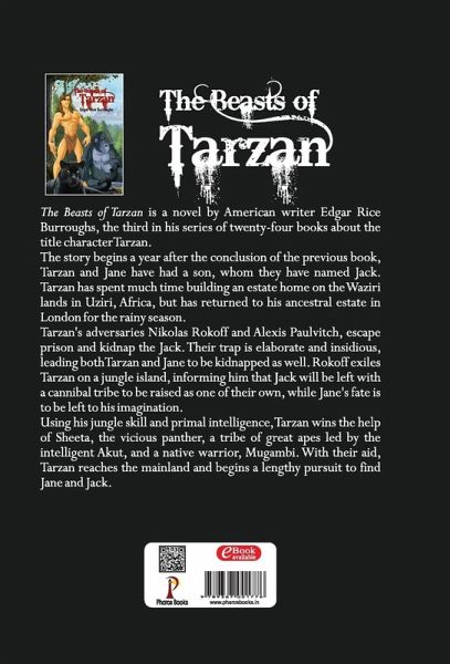 The Beasts of Tarzan is a novel by American writer Edgar Rice Burroughs, the third in his series of twenty-four books about the title characterTarzan. The story begins a year after the conclusion of the previous book, Tarzan and Jane have had a son, whom they have named Jack. Tarzan has spent much time building an estate home on the Waziri lands in Uziri, Africa, but has returned to his ancestral estate in London for the rainy season. Tarzan's adversaries Nikolas Rokoff and Alexis Paulvitch, escape prison and kidnap the Jack. Their trap is elaborate and insidious, leading both Tarzan and Jane to be kidnapped as well. Rokoff exiles Tarzan on a jungle island, informing him that Jack will be left with a cannibal tribe to be raised as one of their own, while Jane's fate is to be left to his imagination. Using his jungle skill and primal intelligence, Tarzan wins the help of Sheeta, the vicious panther, a tribe of great apes led by the intelligent Akut, and a native warrior, Mugambi. With their aid, Tarzan reaches the mainland and begins a lengthy pursuit to find Jane and Jack.
