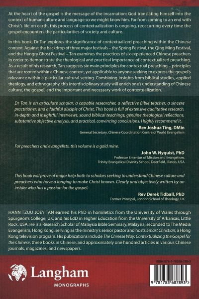 At the heart of the gospel is the message of the incarnation: God translating himself into the context of human culture and language so we might know him. Far from coming to an end with Christ's life on earth, this process of contextualization is ongoing, reoccurring every time the gospel encounters the particularities of society and culture. In this book, Dr Tan explores the significance of contextualized preaching within the Chinese context. Against the backdrop of three major festivals - the Spring Festival, the Qing Ming Festival, and the Hungry Ghost Festival - Tan examines the practices of six experienced Chinese preachers in order to demonstrate the theological and practical importance of contextualized preaching. As a result of his research, Tan suggests six main principles for contextual preaching - principles that are rooted within a Chinese context, yet applicable to anyone seeking to express the gospel's relevance within a particular cultural setting. Combining insights from biblical studies, applied theology, and ethnography, this interdisciplinary study will enrich one's understanding of Chinese culture, the gospel, and the important and necessary work of contextualization.