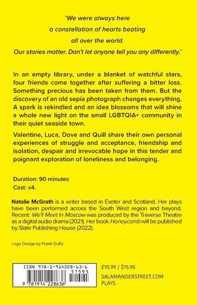 A new LGBTQ+ play. Valentine, Luca, Dove and Quill share their own personal experiences of struggle and acceptance, friendship and isolation, despair and irrevocable hope in this tender and poignant exploration of loneliness and belonging.