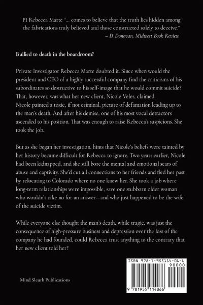 Bullied to death in the boardroom? Private Investigator Rebecca Marte doubted it. Since when would the president and CEO of a highly successful company find the criticisms of his subordinates so destructive to his self-image that he would commit suicide? That, however, was what her new client, Nicole Veles, claimed. Nicole painted a toxic, if not criminal, picture of defamation leading up to the man's death. And after his demise, one of his most vocal detractors ascended to his position. That was enough to raise Rebecca's suspicions. She took the job. But as she began her investigation, hints that Nicole's beliefs were tainted by her history became difficult for Rebecca to ignore. Two years earlier, Nicole had been kidnapped, and she still bore the mental and emotional scars of abuse and captivity. She'd cut all connections to her friends and fled her past by relocating to Colorado where no one knew her. She took a job where long-term relationships were impossible, save one stubborn older woman who wouldn't take no for an answer-and who just happened to be the wife of the suicide victim. While everyone else thought the man's death, while tragic, was just the consequence of high-pressure business and depression over the loss of the company he had founded, could Rebecca trust anything to the contrary that her new client told her?