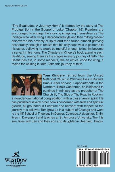 "The Beatitudes: A Journey Home" is framed by the story of The Prodigal Son in the Gospel of Luke (Chapter 15). Readers are encouraged to engage the story by imagining themselves as The Prodigal who, after living a decadent lifestyle and then "hitting bottom", discovered his poverty of spirit and then found himself grieving desperately enough to realize that his only hope was to go home to his father, believing he would be merciful enough to let him become a servant in his home. The Chapters in Kingery's book examine each Beatitude, seeing them as the stages in every journey of faith. The Beatitudes are, in some respects, like an ethical code for living, a recipe for walking in faith. Take this journey of faith.
