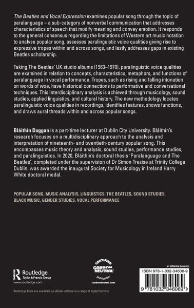 The Beatles and Vocal Expression presents a mixed-methodology for analysing paralinguistic voice qualities, which give rise to performative expressive tropes, that are retained on recordings. Such tropes convey a series of paralinguistic personae that challenge identity construction in song.
