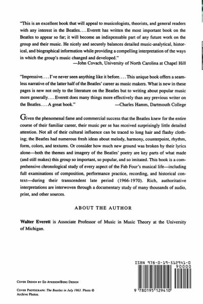Given the phenomenal fame and commercial success that the Beatles knew for the entire course of their familiar career, their music per se has received surprisingly little detailed attention. Not all of their cultural influence can be traced to long hair and flashy clothing; the Beatles had numerous fresh ideas about melody, harmony, counterpoint, rhythm, form, colors, and textures. Or consider how much new ground was broken by their lyrics alone--both the themes and imagery of the Beatles' poetry are key parts of what made (and still makes) this group so important, so popular, and so imitated. This book is a comprehensive chronological study of every aspect of the Fab Four's musical life--including full examinations of composition, performance practice, recording, and historical context--during their transcendent late period (1966-1970). Rich, authoritative interpretations are interwoven through a documentary study of many thousands of audio, print, and other sources.