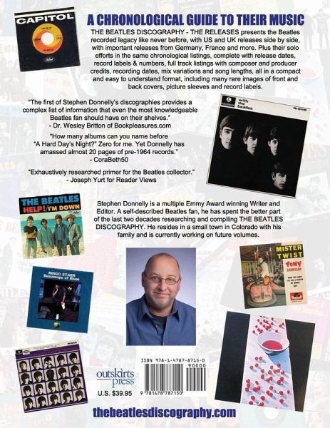 THE BEATLES DISCOGRAPHY - THE RELEASES presents the Beatles recorded legacy like never before. It's all the Beatles US and UK releases side by side, with important releases from Germany, France and more. Plus their solo releases in the same chronological listing, complete with release dates, record labels & numbers, full track listings with composer & producer credits, recording dates, mix variations and song lengths, all in a compact and easy to understand format with many rare images of front & back covers, picture sleeves and record labels. In Volume One - October 1961 - December 1970, Beatles Historian and Emmy Award winning writer Stephen Donnelly, takes us back to the era of Beatlemania. From their first recordings with Tony Sheridan and EMI to their final original album Let It Be and the first releases of John, Paul, George and Ringo as solo artists. This new revised edition features hundreds of larger full-color pictures of all their albums, EPs and singles and restores the original narrative, deleted from the first edition. Journey back to the era of Beatlemania as you flip through the pages and relive the excitement of each new album and each new song, again, for the first time.