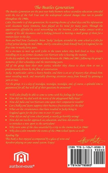 The Beatles Generation are the post-war baby boomers whose secondary education coincided with the rise of the Fab Four, and the widespread cultural changes that ran in parallel throughout the 1960s. Colin Anscombe is one of that generation; his recurring dreams of schooldays and his infatuation with classmate Katy Simmons, have played on his mind for many years. Through the opportunities provided by social networking and the Internet, Colin has made contact with a number of his old classmates and when the reader joins him, he is looking forward to meeting a small group of them for a reunion later in the day. Born and bread New Zealander, Brian Jacko Jackson, attended the same school as Colin for a brief period during the mid-1960s, and by coincidence finds himself back in England for the first time in nearly forty years. He is en-route to meet up with Colin in the town where they both lived as boys, before they travel to see former classmate Ian Harrison's who is hosting the reunion. As the day unfolds the narrative switches between the 1960s and the early twenty first century as the group discuss their memories from those schooldays and the intervening years. All of the group have their own stories; whether they choose to share them or not is largely down to the flow of conversation. Jacko in particular carries a heavy weight and there is an air of mystery that shrouds him; never revealing much and invariably diverting attention away from himself by spinning a yarn or two. For the group, the order of the day is nostalgia, nostalgia, nostalgia.