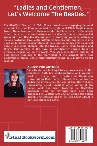 "The Beatles: Live at 12 Cold Creek Street" is an engaging fictional account of the Fab Four set amidst the hysteria of 1960s Beatlemania. Laurie Donaldson, one of their most devoted fans, receives the shock of her life when the band arrives at her doorstep for an unexpected weekend visit. Besides dealing with a annoying younger sibling, a jealous boyfriend, two Beatle-infatuated best friends, and parents who don't understand the magnitude of the situation, Laurie gets a comical once-in-a-lifetime glimpse into the lives of John, Paul, George, and Ringo. This version of the novel is significantly revised from its previous incarnation on the World Wide Web, including a number of new scenes that add to the merriment of the original story that hundreds of online Beatle fans, whether young or old, have enjoyed reading.