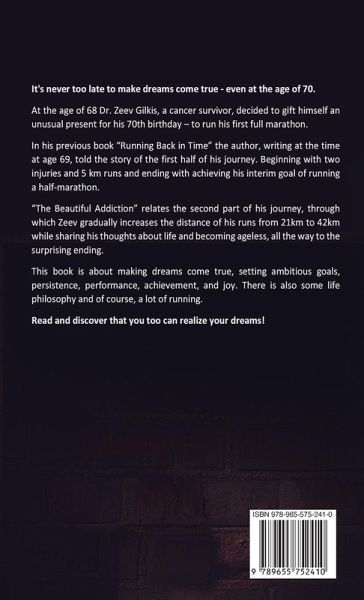 It's never too late to make dreams come true - even at the age of 70. At the age of 68 Dr. Zeev Gilkis, a cancer survivor, decided to gift himself an unusual present for his 70th birthday - to run his first full marathon. In his previous book "Running Back in Time" the author, writing at the time at age 69, told the story of the first half of his journey. Beginning with two injuries and 5 km runs and ending with achieving his interim goal of running a half-marathon. "The Beautiful Addiction" relates the second part of his journey, through which Zeev gradually increases the distance of his runs from 21km to 42km while sharing his thoughts about life and becoming ageless, all the way to the surprising ending. This book is about making dreams come true, setting ambitious goals, persistence, performance, achievement, and joy. There is also some life philosophy and of course, a lot of running. Read and discover that you too can realize your dreams!