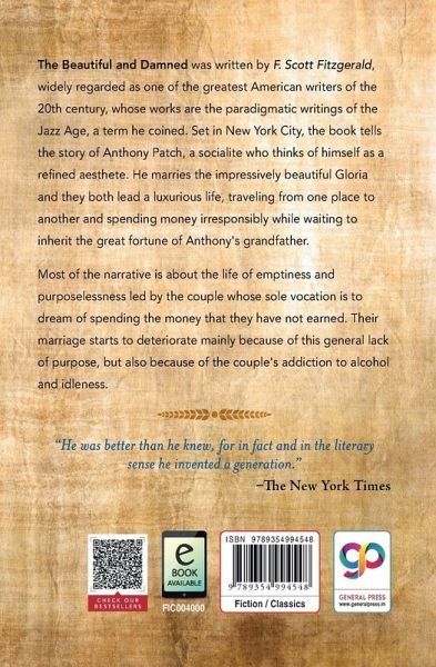 'The Beautiful and Damned' was written by F. Scott Fitzgerald, widely regarded as one of the greatest American writers of the 20th century, whose works are the paradigmatic writings of the Jazz Age, a term he coined. Set in New York City, the book tells the story of Anthony Patch, a socialite who thinks of himself as a refined aesthete. He marries the impressively beautiful Gloria and they both lead a luxurious life, traveling from one place to another and spending money irresponsibly while waiting to inherit the great fortune of Anthony's grandfather. Most of the narrative is about the life of emptiness and purposelessness led by the couple whose sole vocation is to dream of spending the money that they have not earned. Their marriage starts to deteriorate mainly because of this general lack of purpose, but also because of the couple's addiction to alcohol and idleness.