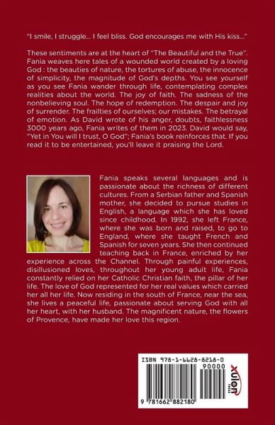 "I smile, I struggle... I feel bliss. God encourages me with His kiss..." These sentiments are at the heart of "The Beautiful and the True". Fania weaves here tales of a wounded world created by a loving God: the beauties of nature, the tortures of abuse, the innocence of simplicity, the magnitude of God's depths. You see yourself as you see Fania wander through life, contemplating complex realities about the world. The joy of faith. The sadness of the nonbelieving soul. The hope of redemption. The despair and joy of surrender. The frailties of ourselves; our mistakes. The betrayal of emotion. As David wrote of his anger, doubts, faithlessness 3000 years ago, Fania writes of them in 2023. David would say, "Yet in You will I trust, O God"; Fania's book reinforces that. If you read it to be entertained, you'll leave it praising the Lord. Fania speaks several languages and is passionate about the richness of different cultures. From a Serbian father and Spanish mother, she decided to pursue studies in English, a language which she has loved since childhood. In 1992, she left France, where she was born and raised, to go to England, where she taught French and Spanish for seven years. She then continued teaching back in France, enriched by her experience across the Channel. Through painful experiences, disillusioned loves, throughout her young adult life, Fania constantly relied on her Catholic Christian faith, the pillar of her life. The love of God represented for her real values which carried her all her life. Now residing in the south of France, near the sea, she lives a peaceful life, passionate about serving God with all her heart, with her husband. The magnificent nature, the flowers of Provence, have made her love this region.