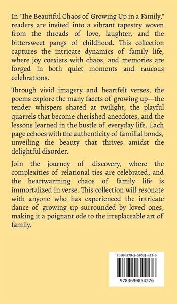 In "The Beautiful Chaos of Growing Up in a Family," readers are invited into a vibrant tapestry woven from the threads of love, laughter, and the bittersweet pangs of childhood. This collection captures the intricate dynamics of family life, where joy coexists with chaos, and memories are forged in both quiet moments and raucous celebrations. Through vivid imagery and heartfelt verses, the poems explore the many facets of growing up-the tender whispers shared at twilight, the playful quarrels that become cherished anecdotes, and the lessons learned in the bustle of everyday life. Each page echoes with the authenticity of familial bonds, unveiling the beauty that thrives amidst the delightful disorder. Join the journey of discovery, where the complexities of relational ties are celebrated, and the heartwarming chaos of family life is immortalized in verse. This collection will resonate with anyone who has experienced the intricate dance of growing up surrounded by loved ones, making it a poignant ode to the irreplaceable art of family.