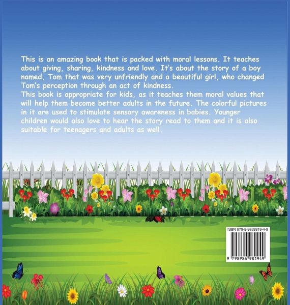 This is an amazing book that is packed with moral lessons. It teaches about giving, sharing, kindness and love. It's about the story of a boy named, Tom that was very unfriendly and a beautiful girl, who changed Tom's perfection through an act of kindness.This book is appropriate for kids as it teaches them moral values that will help them become better adults in the future. The colorful pictures in it are used to stimulate sensory awareness in babies. Younger children would also love to hear the story read to them and it is also suitable for teenagers and adults as well.