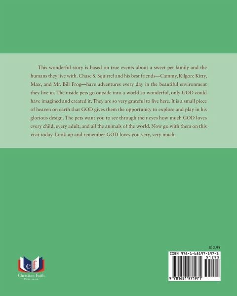 This wonderful story is based on true events about a sweet pet family and the humans they live with. Chase S. Squirrel and his best friends-Cammy, Kilgore Kitty, Max, and Mr. Bill Frog-have adventures every day in the beautiful environment they live in. The inside pets go outside into a world so wonderful, only GOD could have imagined and created it. They are so very grateful to live here. It is a small piece of heaven on earth that GOD gives them the opportunity to explore and play in his glorious design. The pets want you to see through their eyes how much GOD loves every child, every adult, and all the animals of the world. Now go with them on this visit today. Look up and remember GOD loves you very, very much.