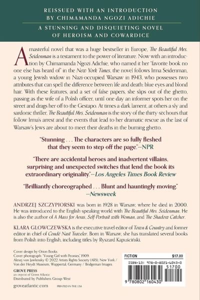 A masterful novel that was a huge bestseller in Europe, The Beautiful Mrs. Seidenman is a testament to the power of literature. Now with an introduction by Chimamanda Ngozi Adichie, who named it her "favorite book no one else has heard of" in the New York Times, the novel follows Irma Seidenman, a young Jewish widow in Nazi-occupied Warsaw in 1943, who possesses two attributes that can spell the difference between life and death: blue eyes and blond hair. With these features, and a set of false papers, she slips out of the ghetto, passing as the wife of a Polish officer, until one day an informer spots her on the street and drags her off to the Gestapo. At times a dark lament, at others a sly and sardonic thriller, The Beautiful Mrs. Seidenman is the story of the thirty-six hours that follow Irma's arrest and the events that lead to her dramatic rescue as the last of Warsaw's Jews are about to meet their deaths in the burning ghetto. -- by Publisher.