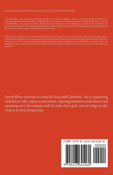 Two lawyers, debt, drugs, desperation, and a crossroads. A story of a shallow man's awakening. Once-prominent young trial lawyer Jake Martin has fallen to the rank of ambulance chaser as a result of a decade controlled by his destructive ego, indiscriminate spending, and substance abuse. One hungover morning near the end of it all, Jake finds he has two cases left in the file cabinet – one good and one bad. And like any normal American, he owes seven-figures to a loan shark. But that's all fine and good because his eccentric, and sometimes brilliant, Cajun law partner Wayne Devereux will be manning the good case today while on the tail-end of an accidental acid trip. Everything should go well, right? Now with only a single dusty bad case left in the file cabinet, desperate Jake contacts an old client with a phone full of powerful contacts. Preying on their desperation, a new acquaintance makes a proposal that, if accepted, will either make Jake and Devereux rich or land them both in prison. As they are about to execute the alleged fool-proof plan, Jake's materialistic needs are disturbed by an encounter with an old girlfriend. He must ultimately decide whether to move forward with the deal or defy the Cartel in favor of a new love and his duty to his last client.