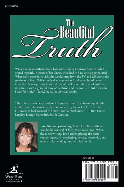 Willie Lee was a diabetic black lady who lived in a nursing home which I visited regularly. Because of her illness, she'd had to have one leg amputated. Whenever I came in to visit, she would turn down the TV and talk about the goodness of God. Willie Lee had an expression I had never heard before. It immediately snagged my heart. She would talk about the love of God and then finish with a graceful wave of her hand and the words, "Darlin', it's the beautiful truth!" I loved the sound of those words. "There is so much peace and joy in Lynn's writing. It's almost liquid right off the page. She wants us, the readers, to truly know His love, to rest in His work, to look forward to heaven, and so much more." -Rev. Laurie Langley, Evangel Cathedral, South Carolina.