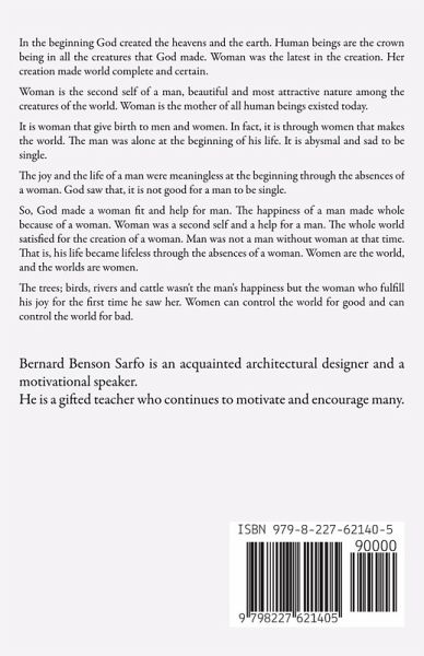 In the beginning God created the heavens and the earth. Human beings are the crown being in all the creatures that God made. Woman was the latest in the creation. Her creation made world complete and certain. Woman is the second self of a man, beautiful and most attractive nature among the creatures of the world. Woman is the mother of all human beings existed today. It is woman that give birth to men and women. In fact, it is through women that makes the world. The man was alone at the beginning of his life. It is abysmal and sad to be single. The joy and the life of a man were meaningless at the beginning through the absences of a woman. God saw that, it is not good for a man to be single. So, God made a woman fit and help for man. The happiness of a man made whole because of a woman. Woman was a second self and a help for a man. The whole world satisfied for the creation of a woman. Man was not a man without woman at that time. That is, his life became lifeless through the absences of a woman. Women are the world, and the worlds are women. The trees; birds, rivers and cattle wasn't the man's happiness but the woman who fulfill his joy for the first time he saw her. Women can control the world for good and can control the world for bad.