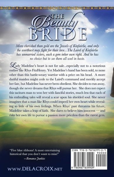 More cherished than gold are the Jewels of Kinfairlie, and only the worthiest may fight for their love...The Laird of Kinfairlie has unmarried sisters, each a gem in her own right. And he has no choice but to see them all wed in haste. Lady Madeline's heart is not for sale...especially not to a notorious outlaw like Rhys FitzHenry. Yet Madeline's hand has been sold, to none other than this battle-weary warrior with a price on his head. A more dutiful maiden might cede to the Laird's command and meekly accept her fate, but Madeline has never been obedient. She decides to run away, though she never dreams that Rhys will pursue her. She does not expect this taciturn man to woo her with fanciful stories, much less that each of his enthralling tales will reveal a scar upon his shielded soul. She never imagines that a man like Rhys could imperil her own heart while revealing so little of his own feelings. When Rhys's past threatens his future, Madeline takes a leap of faith. She dares to believe him innocent - and risks her own life to pursue a passion more priceless than the rarest gem.